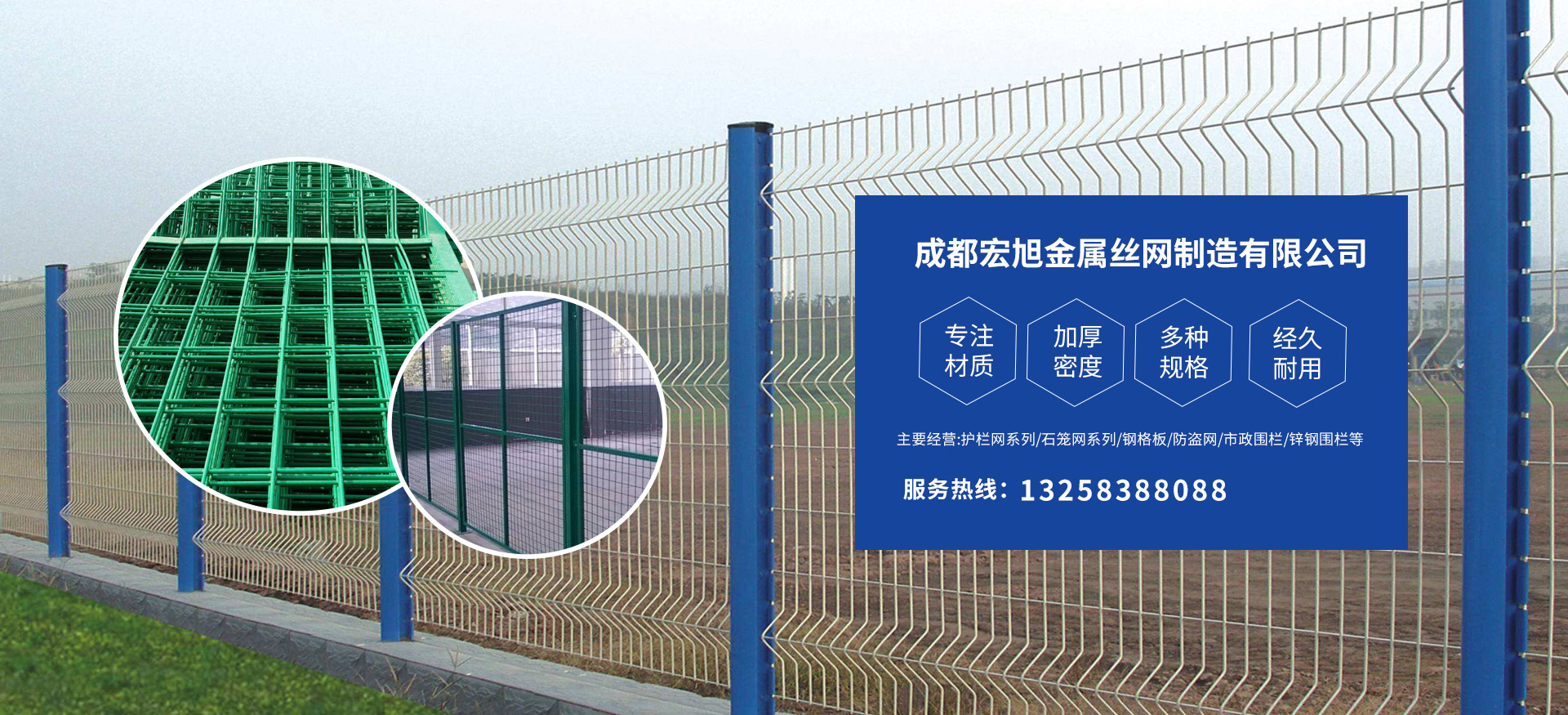成都宏旭金屬絲網(wǎng)制造有限公司主營(yíng)護(hù)欄網(wǎng)系列、石籠網(wǎng)系列、鋼格板、防盜網(wǎng)、市政圍欄、鋅鋼圍欄、鋼筋網(wǎng)片、聲屏障系列、波形護(hù)欄板、柔性纜索護(hù)欄、SNS邊坡防護(hù)網(wǎng)等其他絲網(wǎng)類產(chǎn)品。特殊規(guī)格可加工定做,也可根據(jù)客戶來圖來樣定做。自創(chuàng)業(yè)以來,公司一直堅(jiān)持市場(chǎng)為導(dǎo)向,以客戶為根本,以實(shí)業(yè)為基礎(chǔ),以技術(shù)為支持,以科研為后盾,集科研、生產(chǎn)、經(jīng)營(yíng)為一體,不斷研制開發(fā)新產(chǎn)品,開拓市場(chǎng),走綜合發(fā)展之路。多年來,公司憑借過硬的質(zhì)量,良好的信譽(yù)、優(yōu)質(zhì)的服務(wù)、合理的價(jià)格,贏得了市場(chǎng)和商家的一致好評(píng)。
